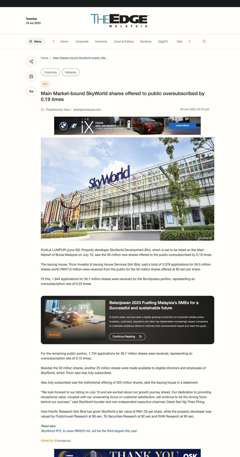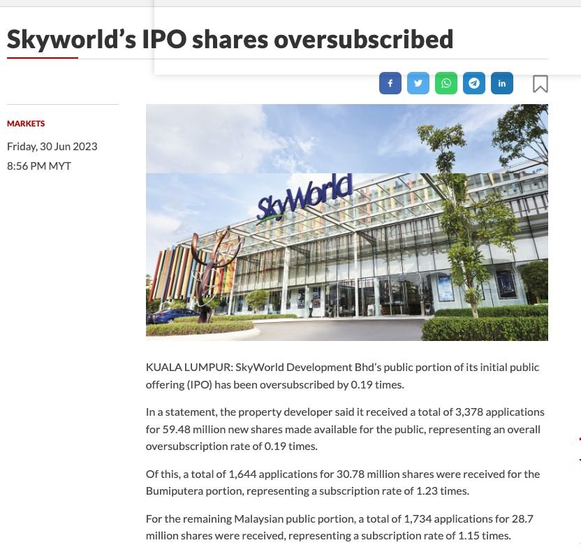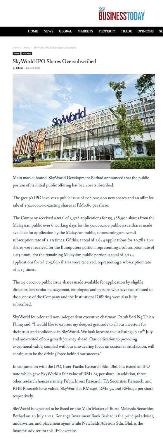 SkyWorld is expected to be listed on the Main Market of Bursa Malaysia Securities Berhad on 10 July 2023. Ahead of the listing, SkyWorld will conduct a virtual webinar to the general public and new shareholders on 8 July 2023 to update on their full year results and growth prospects. Details of the webinar will be made available on SkyWorld’s Official Facebook page at https://www.facebook.com/SkyWorldDevelopment/ or under SkyWorld’s ‘Investor Relations’ tab on their website at www.skyworldgroup.com.my/investor-relations.